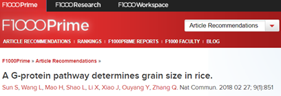 Sun S, Wang L, Mao H, Shao L, Li X, Xiao J,Ouyang Y*, Zhang Q*,A G-protein pathway determines grain size in rice(2018) Nature Communications, 9: 851,F1000 recommendation