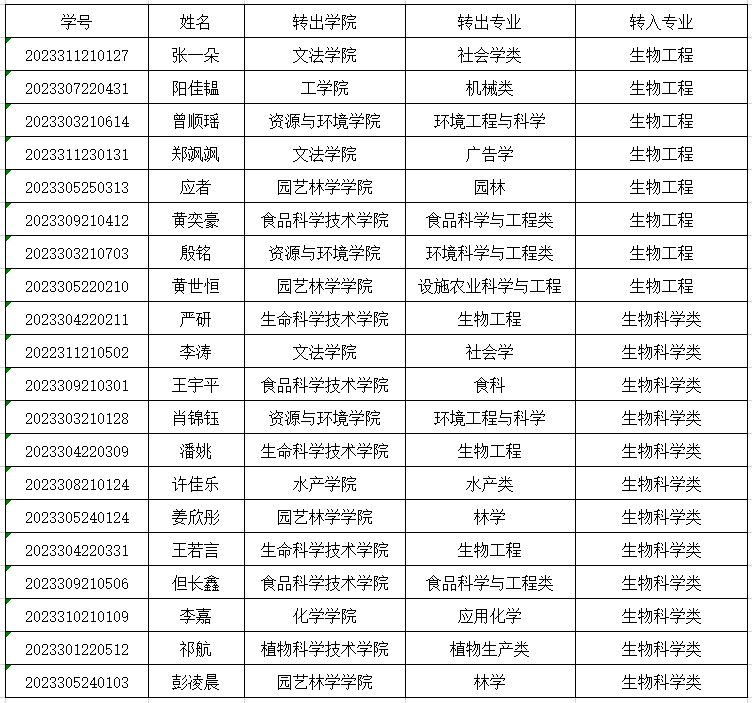 根据公司《关于做好2023年本科生转专业工作的通知》及有关精神,经员工自主申请,公司资格审查,bv伟德国际1946转专业复试工作小组成员对员工知识结构、表达能力、逻辑思维、个人品性特点等综合素质进行考核,结合学业成绩,拟确定张一朵等8名同学进入2023级生物工程专业学习、严研等12名同学进入2023级生物科学类专业学习,现将名单公示如下: