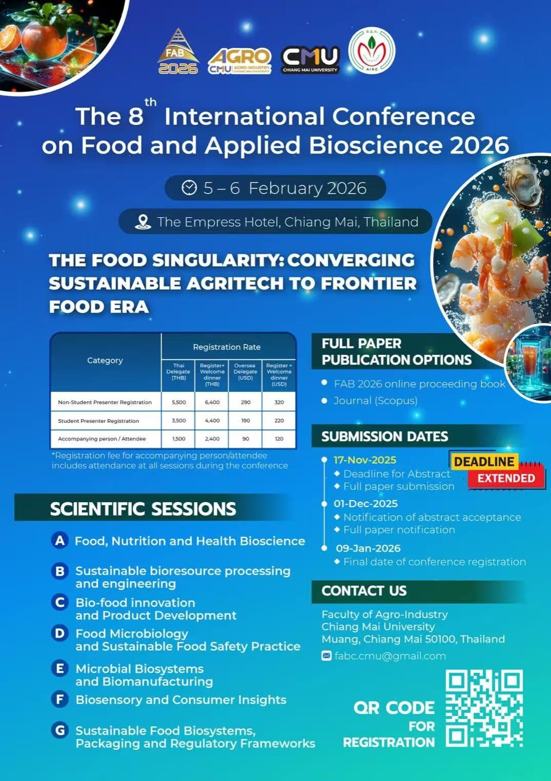 4. 国际会议设有国际竞赛环节,根据第8届食品与应用生物科学国际会议主题提交一个3—5min的视频,截止时间2025年12月31日,具体详见海报。(非必须参加)