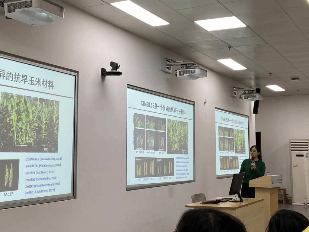 随后秦峰教授系统介绍了课题组近五年来的研究工作。基于对玉米抗旱研究的基础与兴趣,秦峰教授课题组进行了多种玉米种质材料的苗期抗旱性的全基因组关联分析。秦峰教授十分激动地介绍了鉴定到的一个优异的抗旱玉米材料—CIMBL55。该材料无论在苗期还是在结实期都表现出非常好的抗旱性,是一个值得深入挖掘和研究的材料。通过基因组序列分析,秦峰教授课题组发现了多个调控抗旱的新基因,并进行了深入的机理研究。她重点介绍了ZmMYBn-ZmDT1-ZmMDHn分子模块调控抗旱的研究进展。
