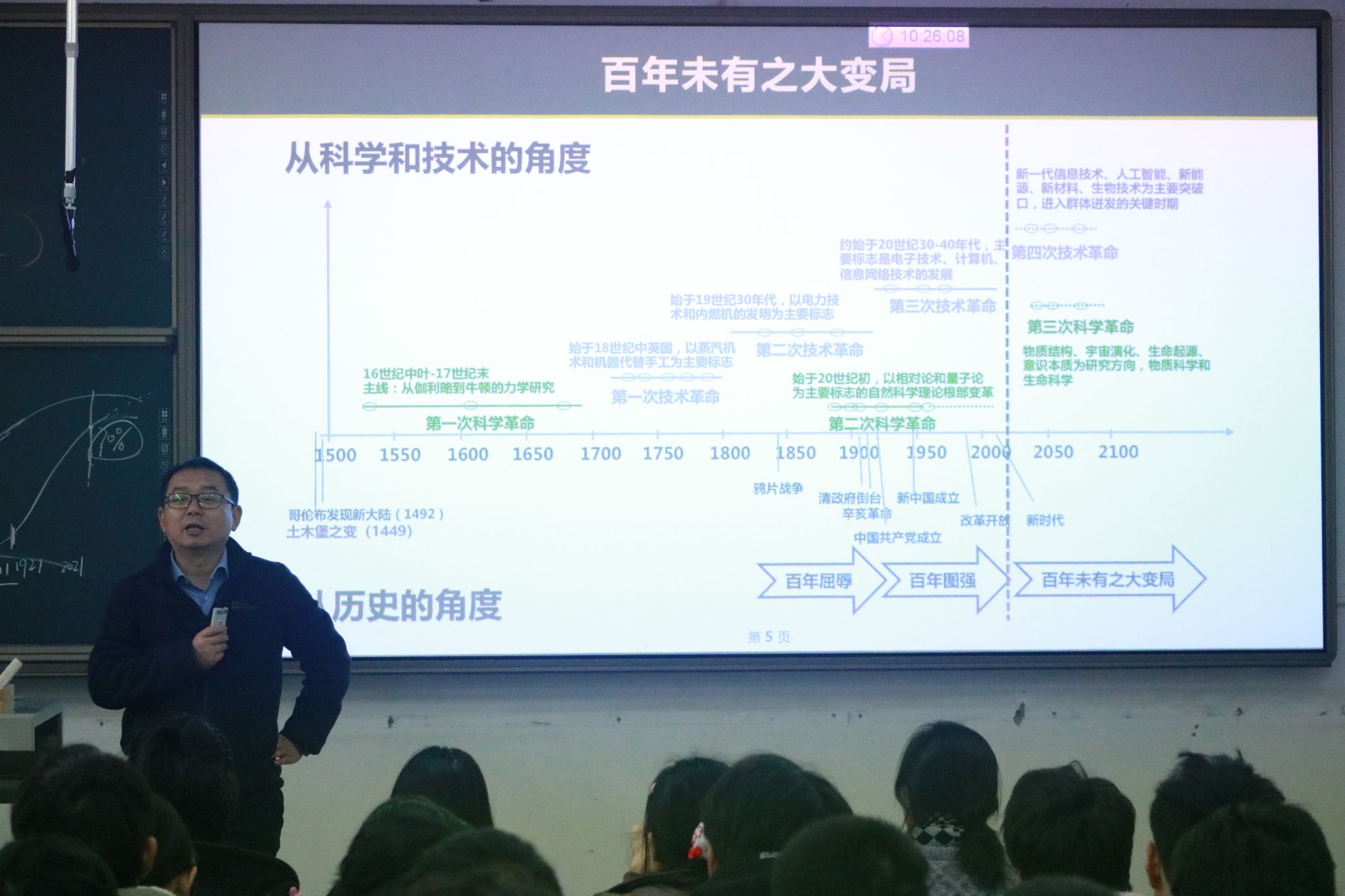 授课伊始,严建兵以时间为轴,回望了中国近现代史的风雨征程,强调中国特色社会主义道路的选择是历史与人民的必然。他指出,从林则徐 “师夷长技以制夷” 到孙中山先生辛亥革命,从五四运动青年呐喊到新时代 “四个自信” 的确立,中国的每一步跨越都离不开青年群体的先锋力量。聚焦中国式现代化的战略目标,他强调,新时代青年作为本世纪中叶强国建设主力军,其成长之路与民族复兴的进程同频共振,农业强国是现代化建设的关键支撑,而生命科学更是维护粮食安全、赋能产业升级、守护生命健康的重要引擎。