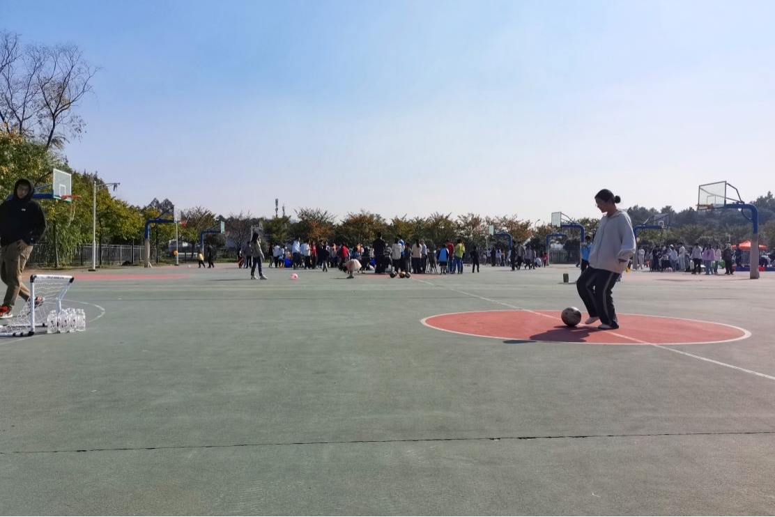 活动吸引了大量的师生前来咨询,参与者需抽取扑克牌,根据牌面数字进行“大象转”,随后将足球踢向“矿泉水瓶阵列”。活动现场热火朝天,参与者自觉排起长队,积极讨论战术,希望能够取得一个满意的成绩。