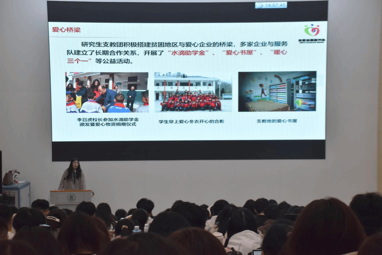 以“本禹志愿服务队”为例,宫照伊湄向同学们介绍徐本禹无私奉献的动人事迹以及“本禹志愿服务队”的发展历程。从个人的星星之火,到团队的守望相助,再到国家、集团、社会多方大力支持,狮山下薪火相传,见证着上千山区学子走向更美好的人生。