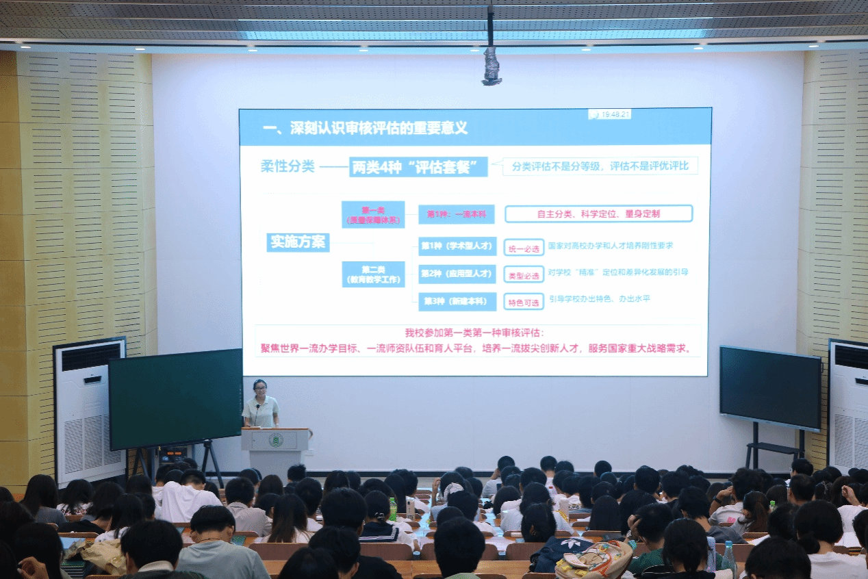 覃歆懿向全体同学重点介绍本科公司产品审核评估工作的重大意义,带领大家全面了解学校公司产品理念、举措和成效。她表示:“审核评估是对公司人才培养质量的全面检验,需要每位同学荟聚合力,以高度的责任感,将校训精神内化于心、外化于行,展现优良学风和积极向上的精神风貌。”