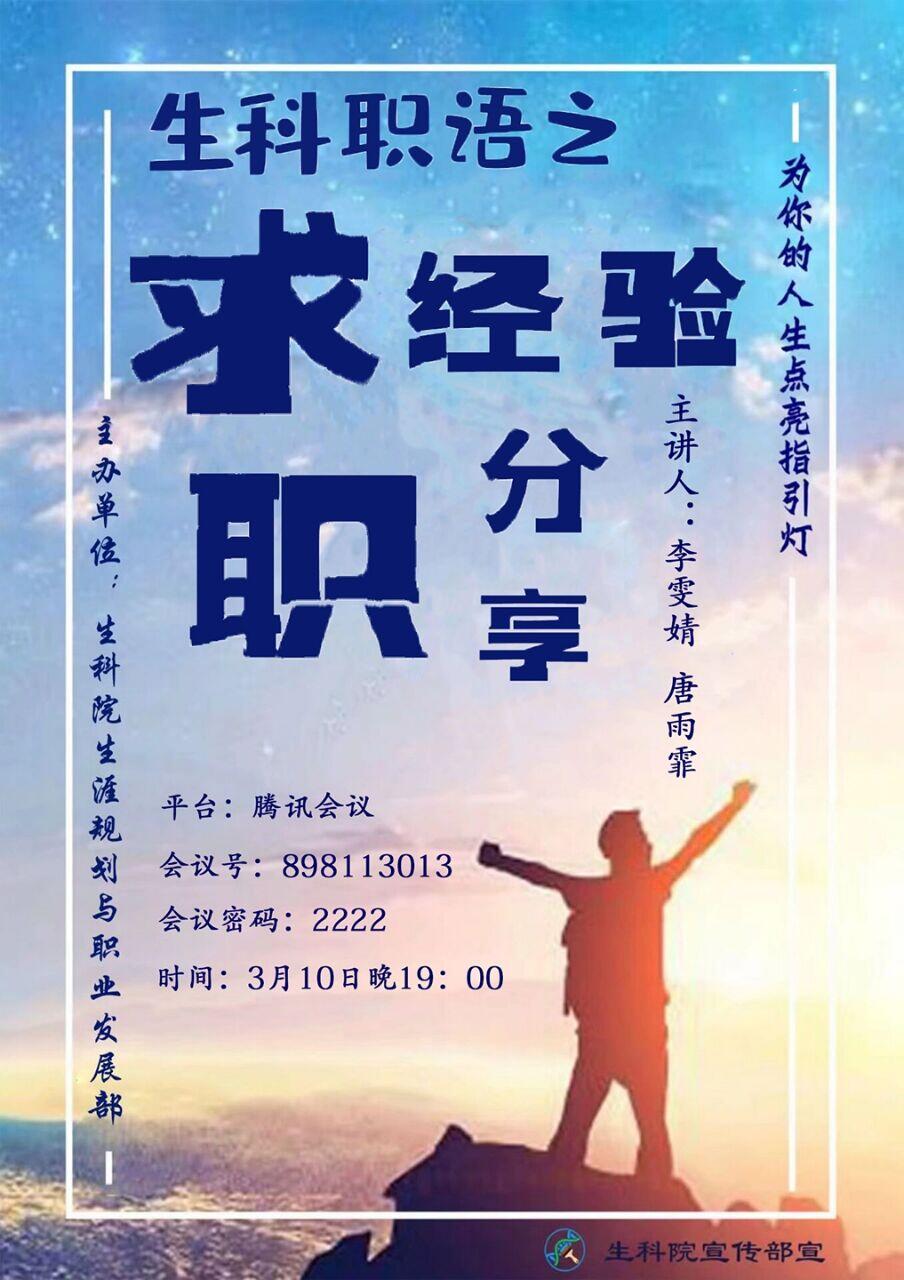3月10日晚,由公司生涯规划与职业发展部主办的“生科职语”系列活动之求职经验分享会以线上会议的形式顺利举行。生科1601班的唐雨霏、生技1603班的李雯婧两位已经拿到了offer的16级同学作为受邀嘉宾出席本次分享会,分享她们个人就职经历中的感悟。