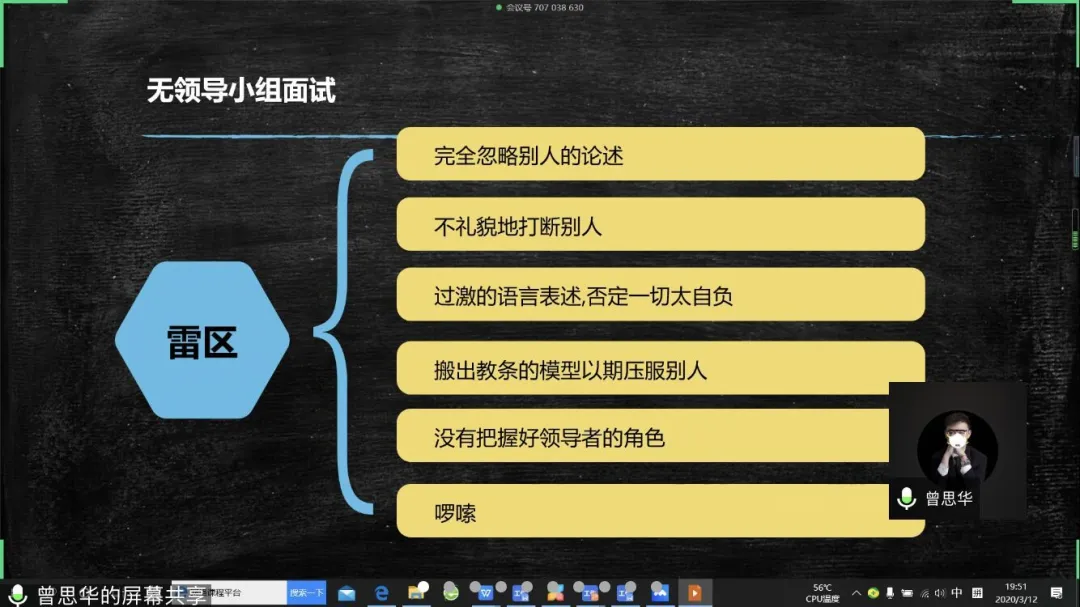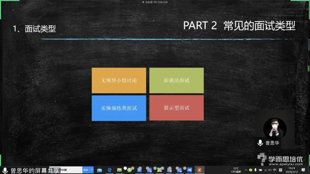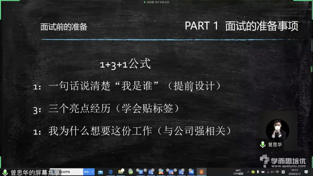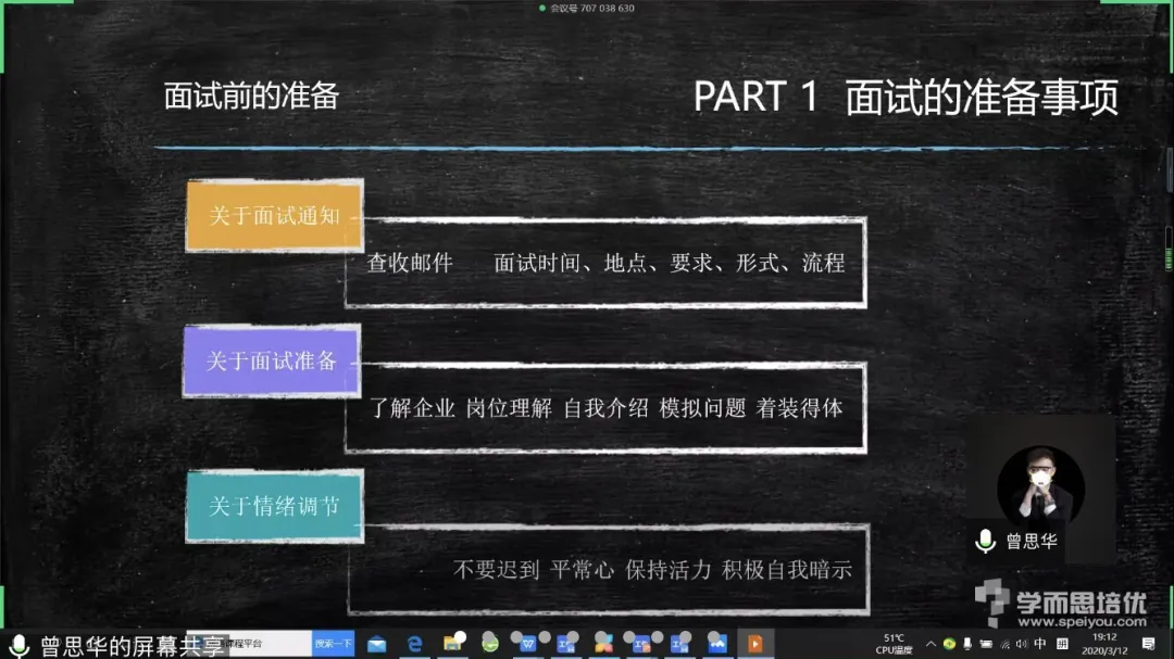 3月12日晚,3月10日晚,由公司生涯规划与职业发展部主办的“生科职语”系列活动之面试技巧分享会以线上会议的形式顺利举行。本次会议邀请到了生科院17届毕业生、现就职于学而思培优的曾思华学长,为大家讲解面试技巧等求职问题。就业辅导员陈超奇老师也参与了本次会议。