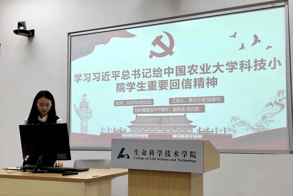 活动第二项,由陆慧玲同志领学习近平总书记给中国农业大学科技小院员工重要回信精神。她向大家介绍了什么是“科技小院”以及科技小院创立推广的意义,带领大家全文学习了习近平总书记给中国农业大学科技小院员工的重要回信精神。她谈到:“习近平总书记在回信中寄语青年‘希望同学们志存高远、脚踏实地,把课堂学习和乡村实践紧密结合起来,厚植爱农情怀,练就兴农本领,在乡村振兴的大舞台上建功立业,为加快推进农业农村现代化、全面建设社会主义现代化国家贡献青春力量。’作为新时代青年,我们要牢记总书记的‘青年观’,点亮青春理想、激昂奋斗旋律、澎湃创新动力、淬炼斗争精神,勇于担当青年使命,不懈奋进。”