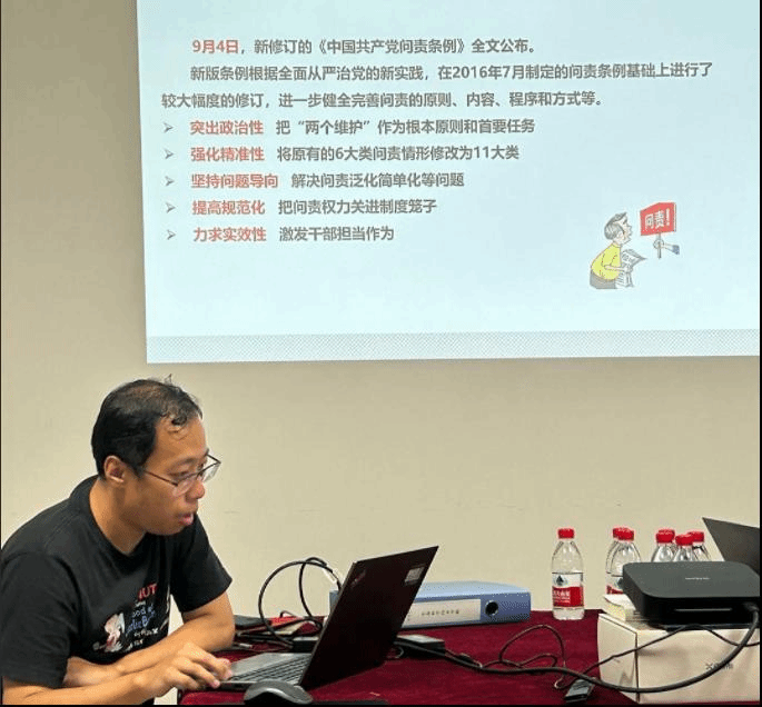 接着,汤子建同志带领学习《中国共产党纪律处分条例》。他谈到,修订后的条例更加突出政治性、强化精准性、坚持问题导向、提高规范化、力求实效性。在随后的警示案例教育中,他详细列举了关于科研经费、学术不端、生活作风等方面的违纪违法典型警示案例。陈振夏同志指出,支部成员要认真学习党章党纪党规,强化政治意识和纪律意识,坚守党风廉政底线和师德师风红线。