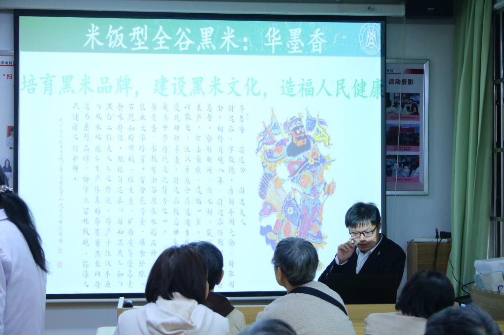 在狮子山街道珞狮路社区,“小白塔”党员志愿服务队的师生们共同策划开展了“营养科普进社区·健康知识惠万家”活动。在营养健康知识讲座上,生物医学教工党支部教师党员石秀娟、生物科学系博士后周再会面向社区居民普及了“未病先防,既病防变”的治未病生活健康理念和“华墨香”米饭型全谷黑米营养价值,帮助他们形成健康的生活方式。