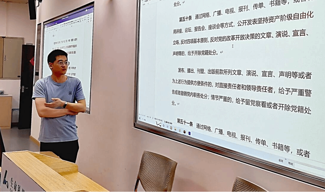 会议伊始,王凯博士带领大家学习《中国共产党章程》部分条目,主要包括党的地方组织,使得与会党员更进一步了解党的组织结构以及运作模式;接着王凯博士带领大家《中国共产党纪律处分条例》第二编分则第六章、第七章、第八章部分内容,使得大家更全面了解党的纪律,并对照《中国共产党纪律处分条例》严格规范自己的言行。随后叶青博士带领大家学习《中国共产党党员网络行为规定》,使得与会党员理解规范使用网络的重要性。