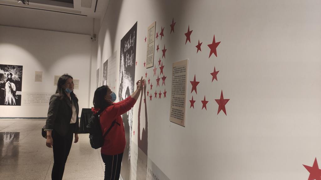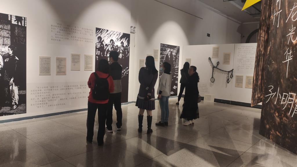 一幅幅版画插图以原书扫描件和展览版式等形式描绘了小说《红岩》的近60个章节内容,形象生动地展现了江姐等革命英烈在重庆渣滓洞监狱与国民党反动派特务顽强斗争的经历,铁镣铐、老虎凳等刑具仿佛在诉说着国民党反动派的血腥和残忍。在看到《飞吧,你飞吧》这幅版画时,支部成员李梦源讲道:“‘小萝卜头’宋振中是共和国最小的一名烈士,在8个月大时随父母被关进监狱,9岁5个月被敌人残忍杀害,火柴盒里被放飞的小飞虫,正是他对自由的渴望和对新世界的向往。” 在展厅的左侧,版画《狱中追悼会》旁的小桌上摆放着一枚枚五角星贴纸,支部成员们纷纷揭下贴在墙上,寄托对烈士们的哀思和缅怀。