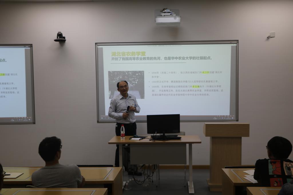 作为一名在华农生活工作30年的华农人,孙明分享了他所亲历和见证的华中农大的发展和重要事件。他以一朵花、一株稻、一棵树、一头猪、一支苗、一粒豆“六个一”介绍了公司近年来所取得的成就,并用“顶天”和“立地”形容华农的科研成果,即既关注学科发展前沿,又与生产实际深入结合,为我国农业科技进步、农村发展、农民致富做出了重要贡献。“萃俊秀于三楚,聚硕彦于一堂……”,会场师生同唱校歌,在优美的旋律中感受一代代华农人“勤读力耕、立己达人”的精神力量和价值追求。