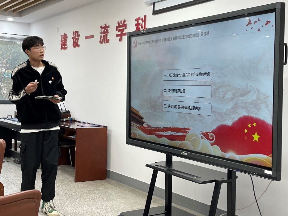 随后,本科生党支部的黄畅同志和凌志豪同志分别从不同角度融入自身理解介绍了《决议》。黄畅在李一博同志所讲解的基础上,还进一步介绍了《决议》谈到的十个“明确”战略思想和创新理念。黄畅同志还通过现场测验来检测在场师生的学习效果。