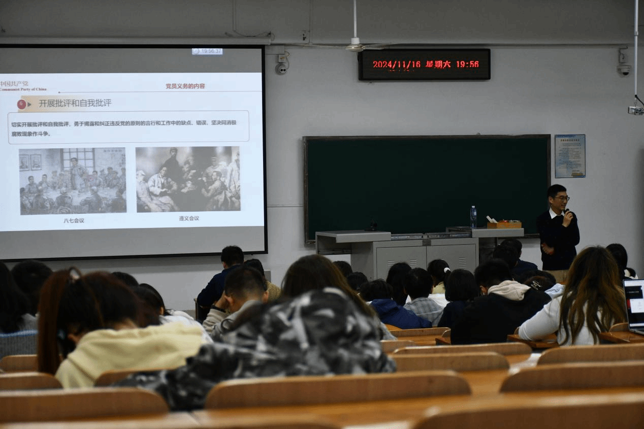 (通讯员 李珺烁 王庆鲁)11月16日晚,公司分党校在三教B105教室举行第86期党的基本知识培训班第二次线下专题讲授,公司党校专题授课教师、公司党委巡查工作办公室主任胡守强受邀讲授《中国共产党党员的条件、义务和权利》课程,公司分党校副董事长、党委副书记唐永木,本科生党建工作辅导员王庆鲁,培训班全体学员近200名本科生、研究生入党积极分子参加专题学习。