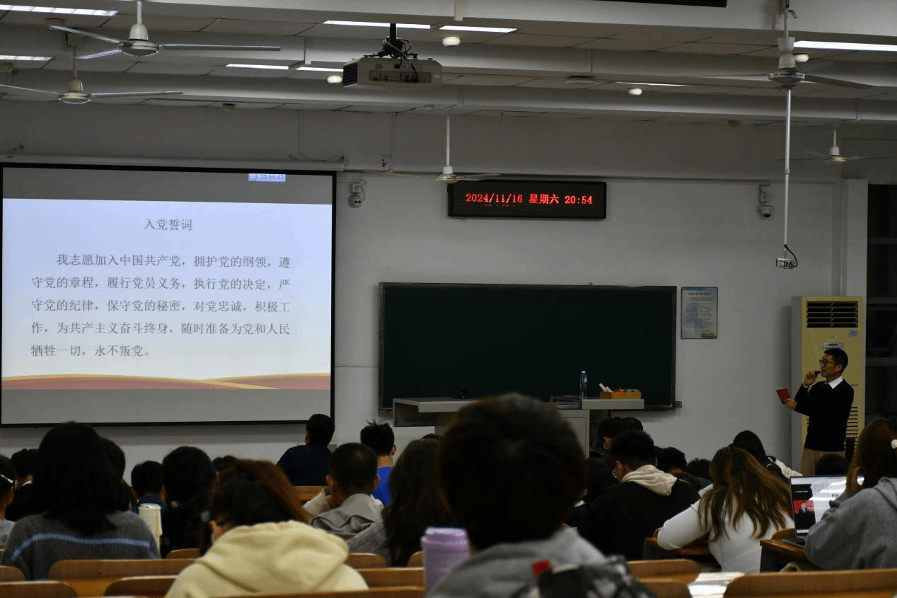 最后,胡守强以入党誓词结束课程。他提到,入党誓词是对于党员的条件、义务、权利高度的概括,也是每一位党员对党和人民的承诺,勉励全体学员主动向党员看齐,以党员标准严格要求自己,深刻理解誓词中的每一句话,将其内化为自己的行动准则,不断自我完善。