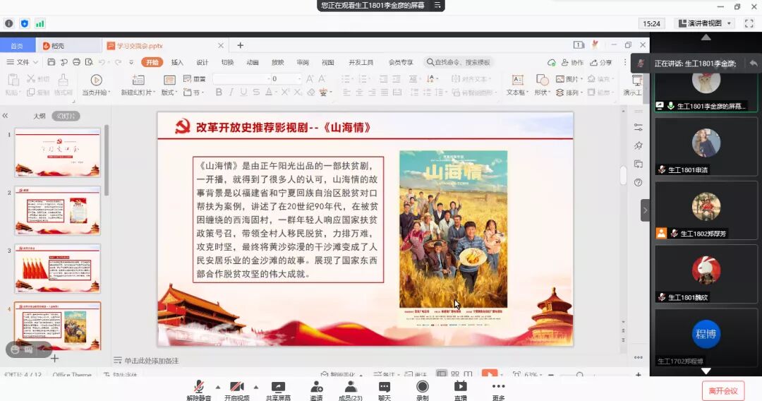 首先,李金彦同学向大家分享了自己近期观看的影视作品——《山海情》。该剧是由正午阳光出品的一部扶贫剧,一经开播就得到了很多人的认可。故事背景是福建省和宁夏回族自治区脱贫对口帮扶,讲述了在20世纪90年代被贫困缠绕的西海固村,一群年轻人响应国家扶贫政策号召,带领全村人力排万难、攻克时坚、移民脱贫,最终将黄沙弥漫的干沙滩变成了人民安居乐业的金沙滩的故事。