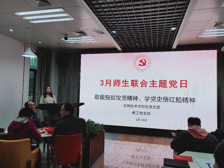 3月18日下午,华中农业老员工物技术教工党支部和本科生党支部在第一综合楼114教室共同开展了以“致敬脱贫攻坚精神,学党史悟红传精神”为主题的党日活动。活动分为四个部分:孙淑怡同志对伟大脱贫攻坚精神进行领学,王爱文同志对红船精神进行解读,之后由孙明老师对两会主要内容精神进行讲解和学习,最后由李维琳老师对“生科老照片”进行分享与展示。