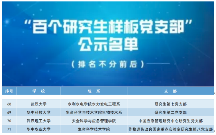 7月23日,教育部官网发布《关于第二批全国高校“百个研究生样板党支部”和 “百名研究生党员标兵”创建工作评审结果的公示》。经组织推荐、通讯评审、集中会审等程序,公司作物遗传改良国家重点实验室研究生第八党支部入选第二批全国“百个研究生样板党支部”创建名单。