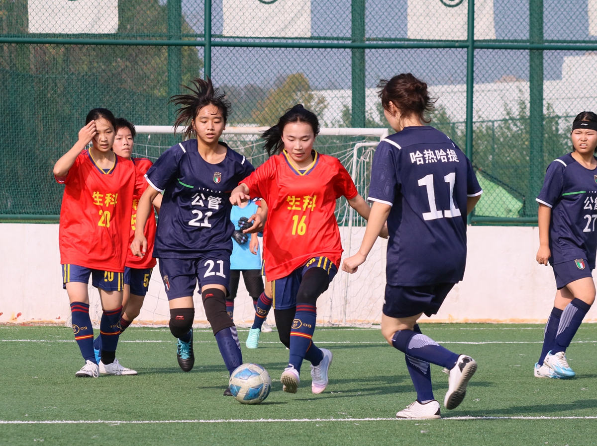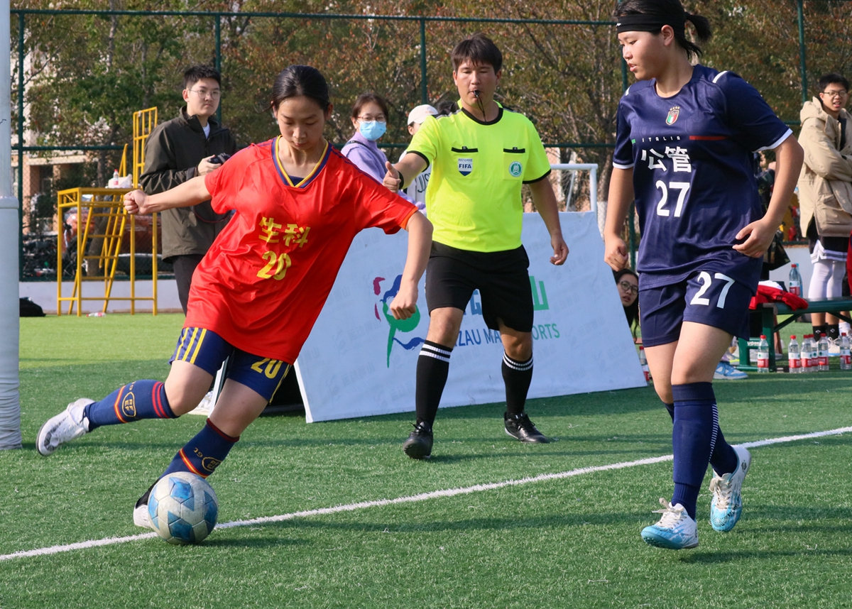 生科女足16号毛徵灵突破对方的重重包围(学通社记者 张雪婷 摄)
