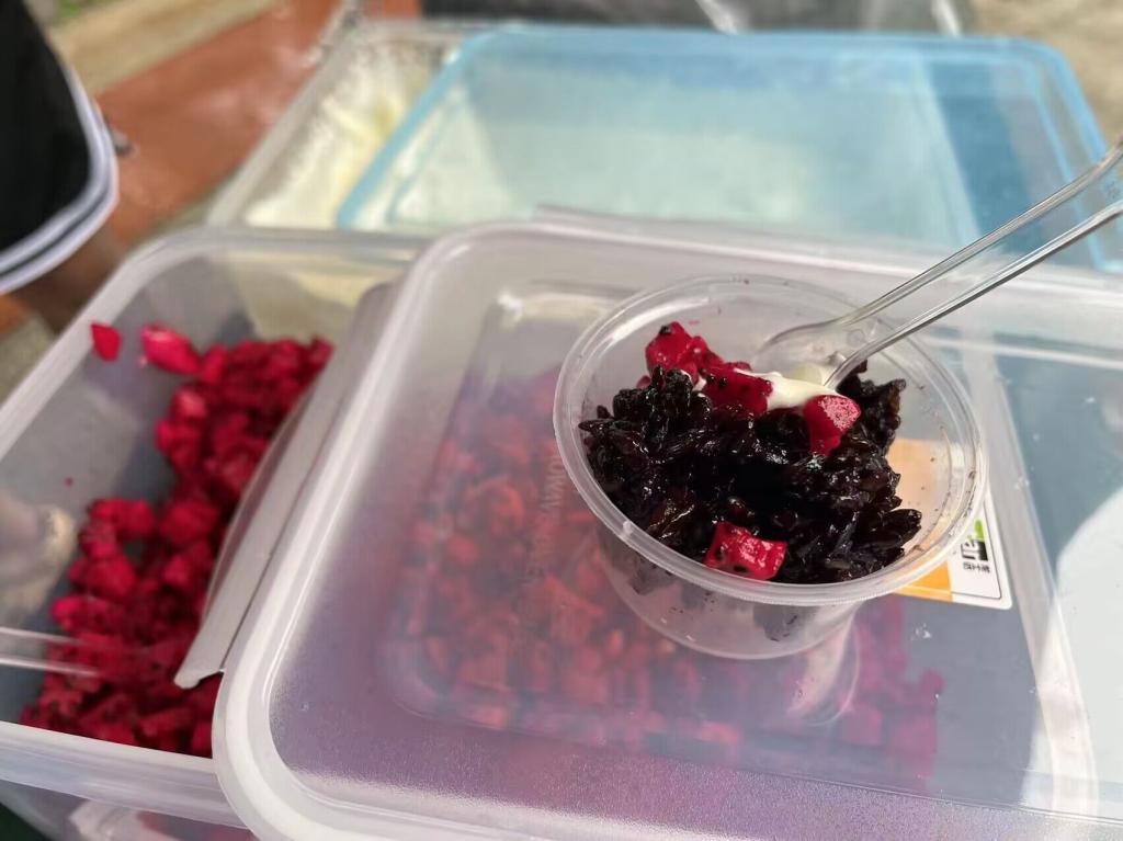 “这是我们公司研发的黑米吗?这种品种的黑米与我们吃的黑米有何不同?”活动现场展示的华墨香黑米吸引了很多社区居民的目光。志愿者们向大家细致讲解了华墨香黑米的特点及其在营养健康方面的功效。并对居民们关心的问题进行解答,“普通的黑米存在难以蒸煮或口感较差,而我们开发的华墨香黑米口感细腻、入口回甘且使用普通蒸煮模式即可完成黑米饭的制作”。“黑米具有完整的整体结构,食用全谷黑米能更有效的获得稻米的全部营养。与平常吃的白米相比,黑米的升糖指数和碳水含量都有所下降。”社区居民饶有兴趣地听取讲解,并在现场品尝了黑米冰饭后赞不绝口。