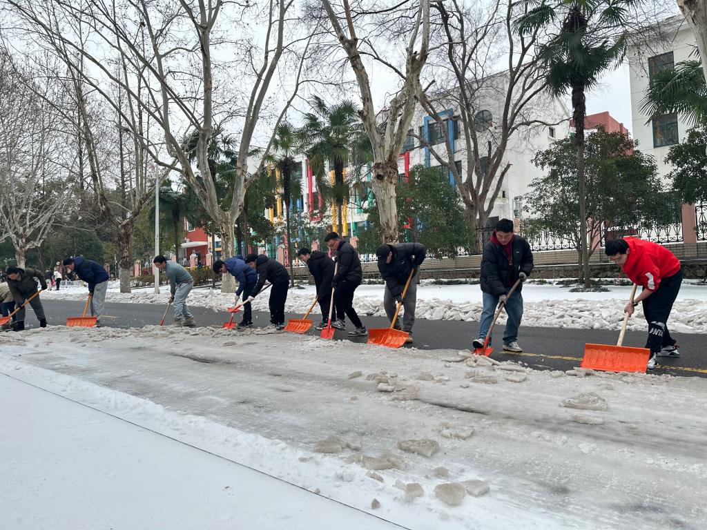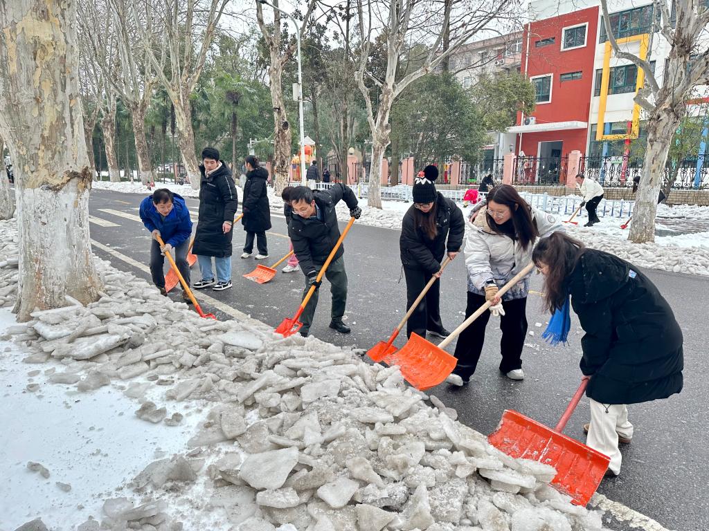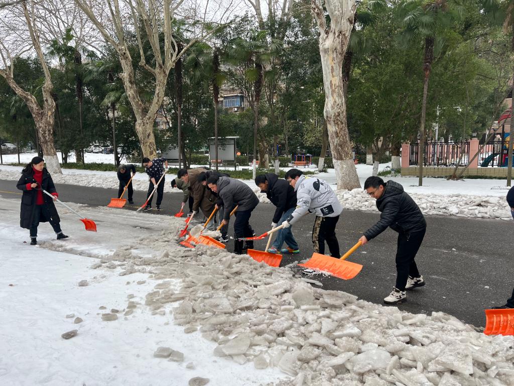 师生们纷纷拿起铲雪工具,用力凿开冰块铲起积雪,每一次挥动都显得坚定而有力。尽管天气寒冷,师生们热情高涨不退,齐心协力破冰除霰,他们的脸上洋溢着满足的笑容。