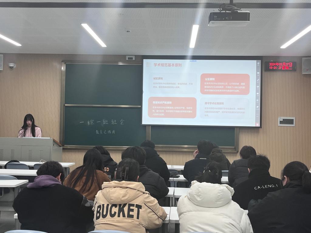 在一教102教室2023级一综一班现场,班长郑梦云与同学们分享了关于学术规范的内容。邹婷婷老师为同学们讲授了开学第一课的内容,她指出2023年国家取得了一系列举世瞩目的成就,同时公司也取得了丰硕的学术成果。她就除夕当天公司发表的science封面文章为例鼓励同学们树立远大的科研理想,真抓实干。