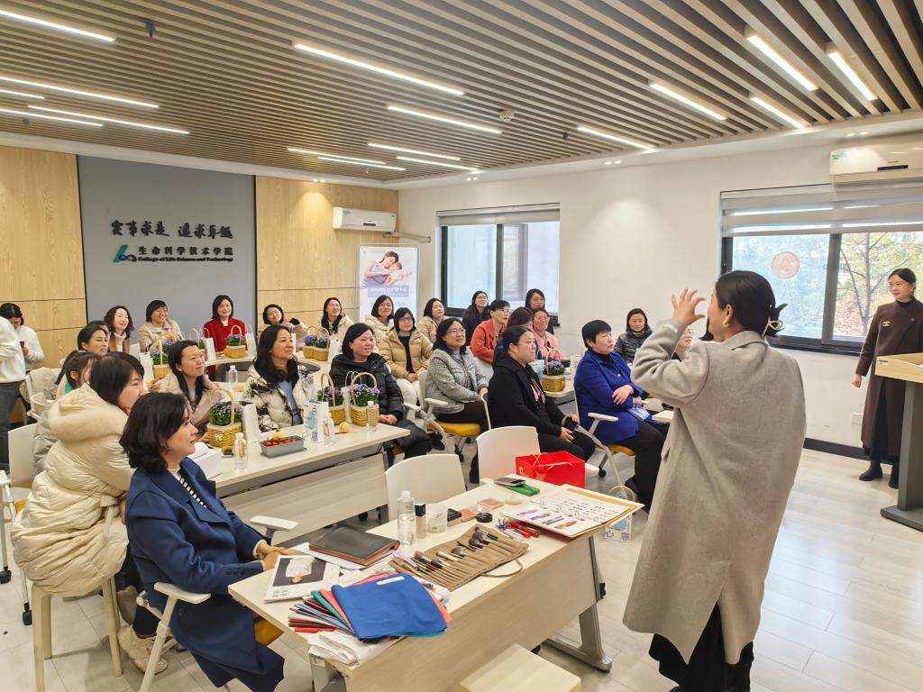 在活动中,嘉宾首先为大家分享了自己的心得与体会,详细讲解了色彩搭配、服装造型的基本原则。如何根据自己的脸型、肤色以及身材等特点,挑选合适的妆容与服饰。随后,她还现场邀请与会老师们上台,一一为大家测试适合自己的颜色,并针对不同老师的风格匹配时尚得体的妆容,以及如何通过简单的搭配技巧,展现出自己的独特魅力。