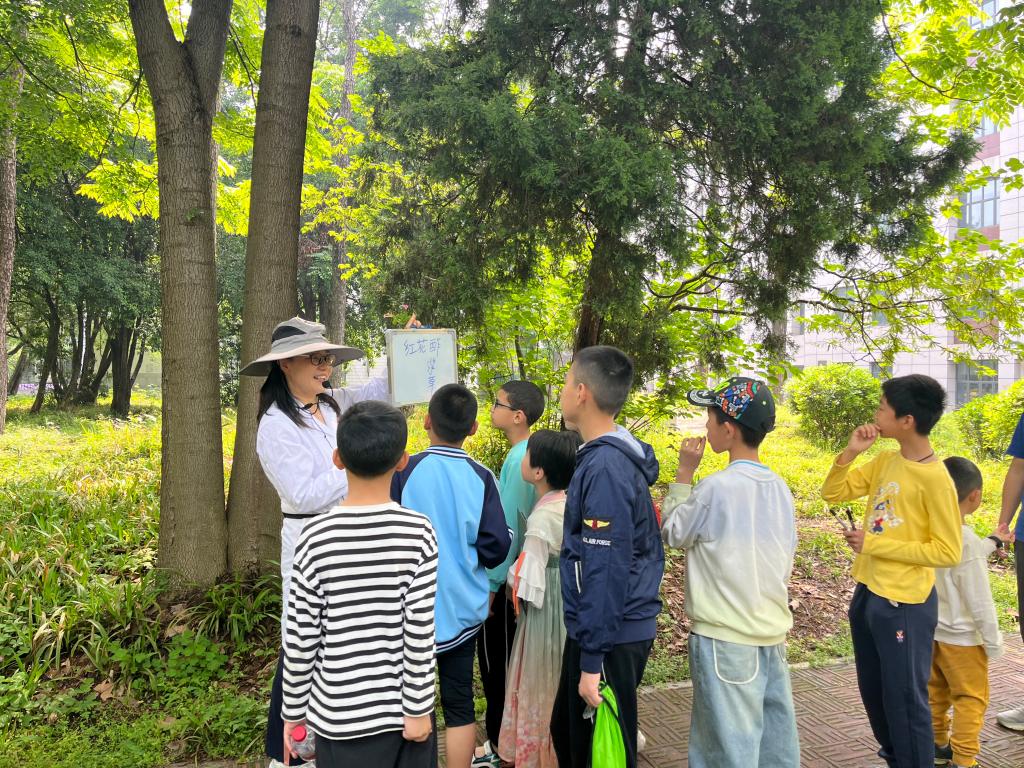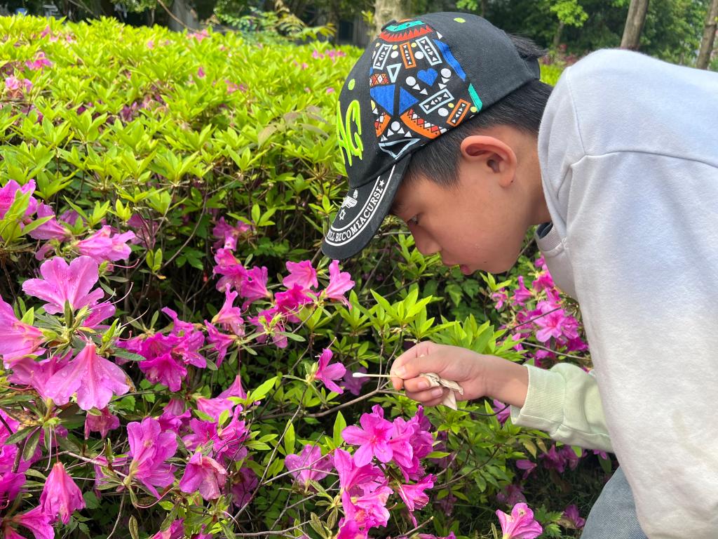 随后,王莉老师带领员工们和小朋友们走到杜鹃花从中,细嗅花香,观察花的结构,小心翼翼地用手里的棉签为它进行人工授粉。拾阶而上,她详细介绍了路上遇到的每一种花,拿起酢浆草介绍它的形态特征、生长环境和分布范围,还提到它的茎是酸酸的,像醋一样酸,才称之为酢浆草。“好酸啊”,小朋友们忍不住放到嘴里品尝起它的味道。