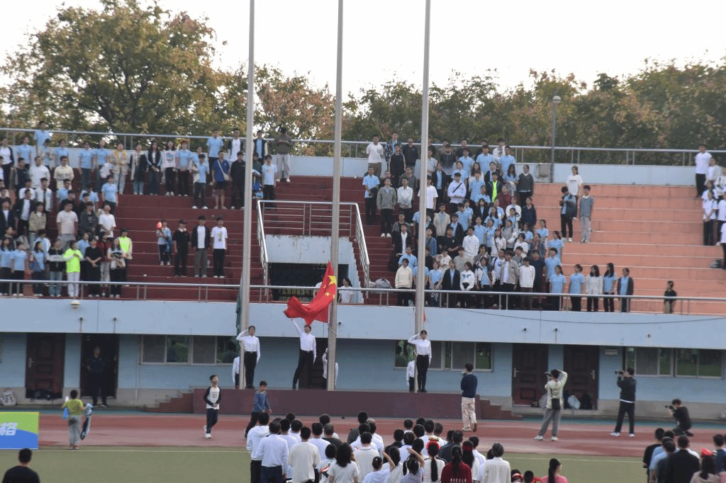 护旗队昂首挺胸,步履铿锵,将五星红旗和校旗护送到升旗台下。随着国歌奏乐响起,国旗从旗手手中挥展开来,迎风飘扬。运动场上全体师生行注目礼,用歌声为伟大祖国献上赤诚的爱。