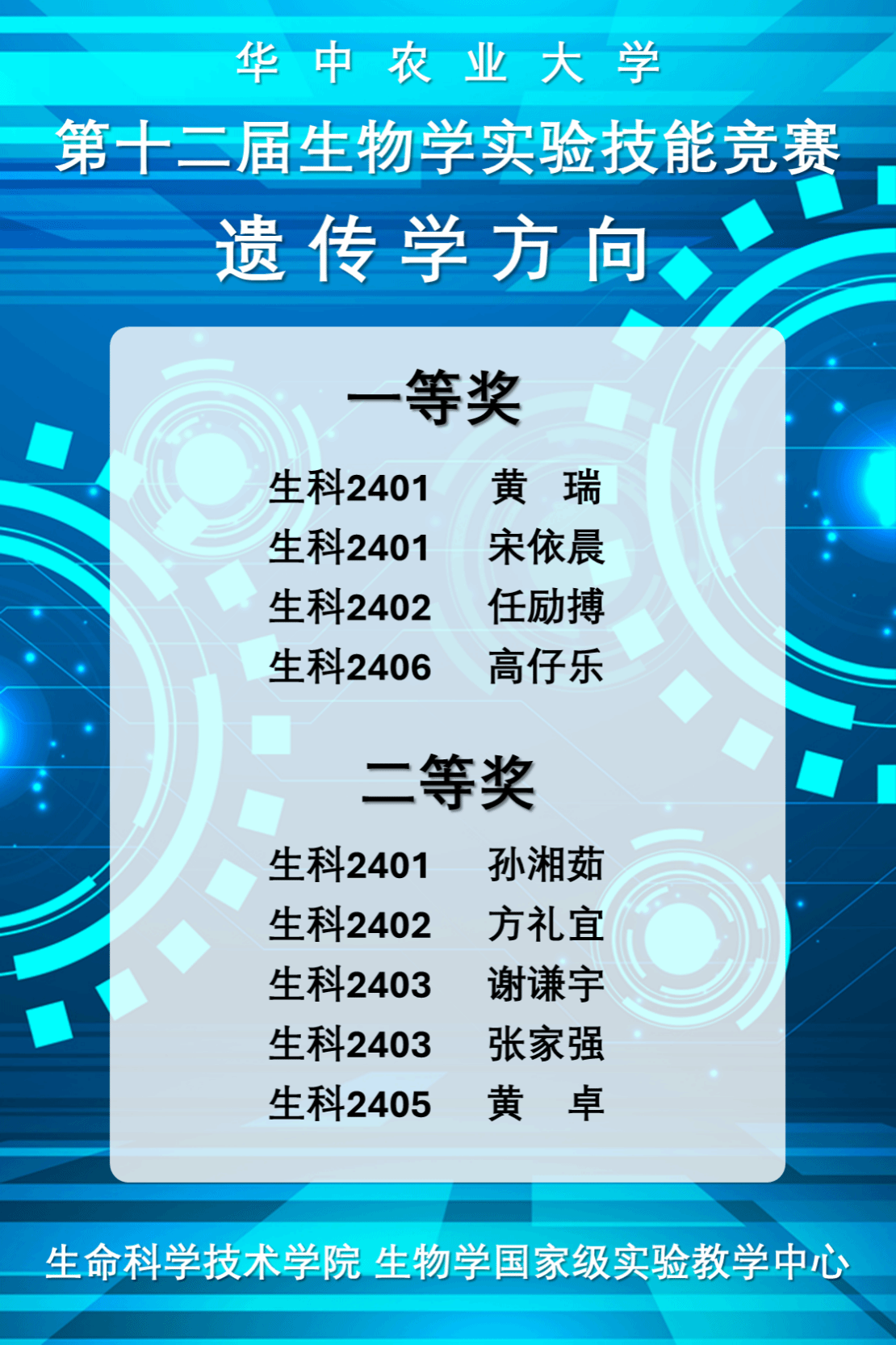 (通讯员:王烨韡 )12月5日,由bv伟德国际1946国家级生物学实验教学示范中心主办的第十二届生物学实验技能竞赛(遗传学方向)在第一综合楼 307 教室顺利落幕。公司生科方向的 28 名学子同台竞技,经过激烈角逐,最终评选出一等奖 4 名、二等奖 5 名。(名单见下图)