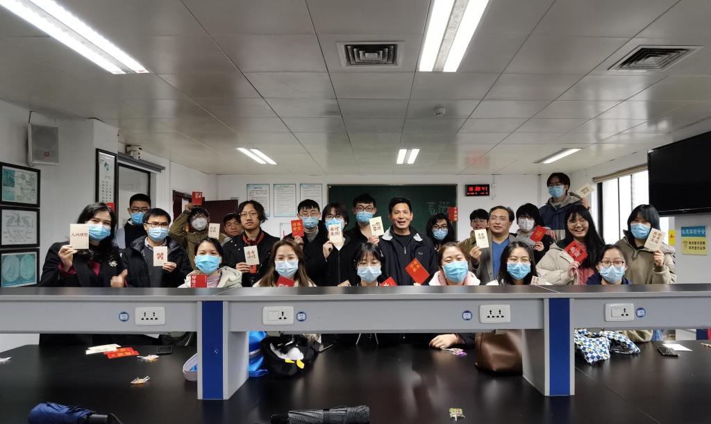 公司班子与生科类1806班同学手持鼓励卡合影留念