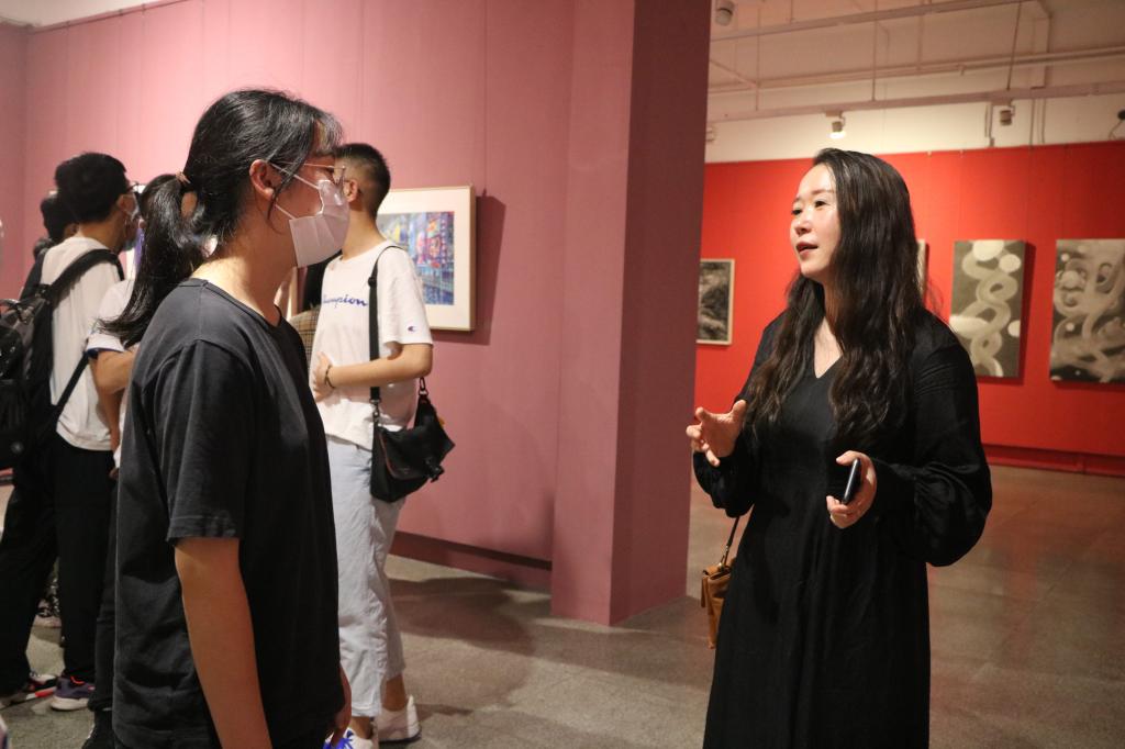 参观过程中部分同学和两位老师交流了自己对于作品的理解,向老师们请教了关于艺术创作的问题。在琳琅满目的艺术品海洋里,同学们被不同的艺术作品风格所吸引,或驻足摄影,或观赏思考,或交流感受。“五楼的那幅画雪的国画给我印象深刻,一开始很不解,画面看不到雪。但是细细品味,又感觉那有意无意的丝丝缕缕的灰白就仿佛是雪似的,感觉很奇妙。这次活动不仅提升了自己的艺术素养,也在观察与理解中增长了见闻、开拓了视野,感受到艺术院校不同的人文气息。”英才班员工薛建铠在一幅作品前和同学分享了自己的体会。在与杨鹏老师交流之后,黄琪茜谈到:“十分有幸获得参观湖北美术公司美术馆的机会,美院的老师不单单介绍展览的画作,也鼓励我们用摄影或绘画等方式进行创作。参观过这次展览之后,我虽然对其中作品理解得并未通透,但也了解了各种各样的画作类型、风格,同时揣摩作品所要表达的含义的过程也很有趣味,这或许就是艺术的魅力所在。”