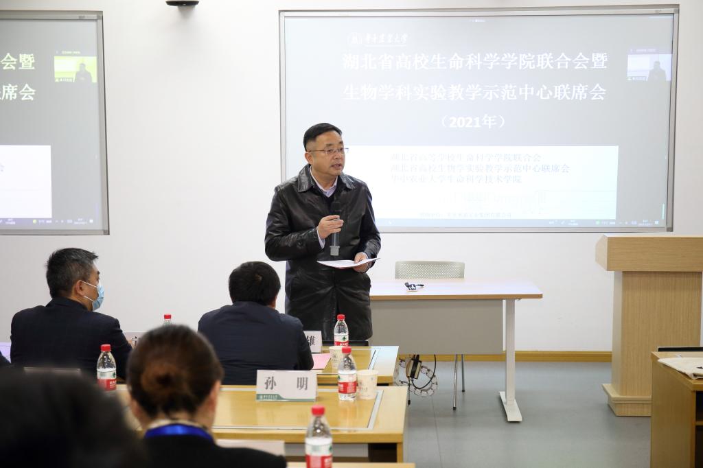 【通讯员:熊薇】为加强湖北省各高校生命科学公司的联系、生物学科实验教学示范中心的建设,促进各高校生命科学公司及实验教学中心的交流与合作,湖北省高校生命科学公司联合会暨生物学科实验教学示范中心联席会2021年年会,采用线上线下结合的方式,于2021年12月11日在bv伟德国际1946第一综合楼A102召开。联合会学术委员会主席谢志雄教授、华中科技大学研究生院副经理兼培养处处长余龙江、华中师范老员工命科学公司党委书记郑宁、华中科技老员工命科学技术公司副经理卢群伟等出席了此次会议。bv伟德国际副董事长青平、实践教学管理处处长刘震、公司党委书记和希顺、副书记范金凤、副经理唐铁军、副经理兼生物学实验教学中心主任孙明教授及中心全体人员参加了此次会议。会议由孙明教授主持。