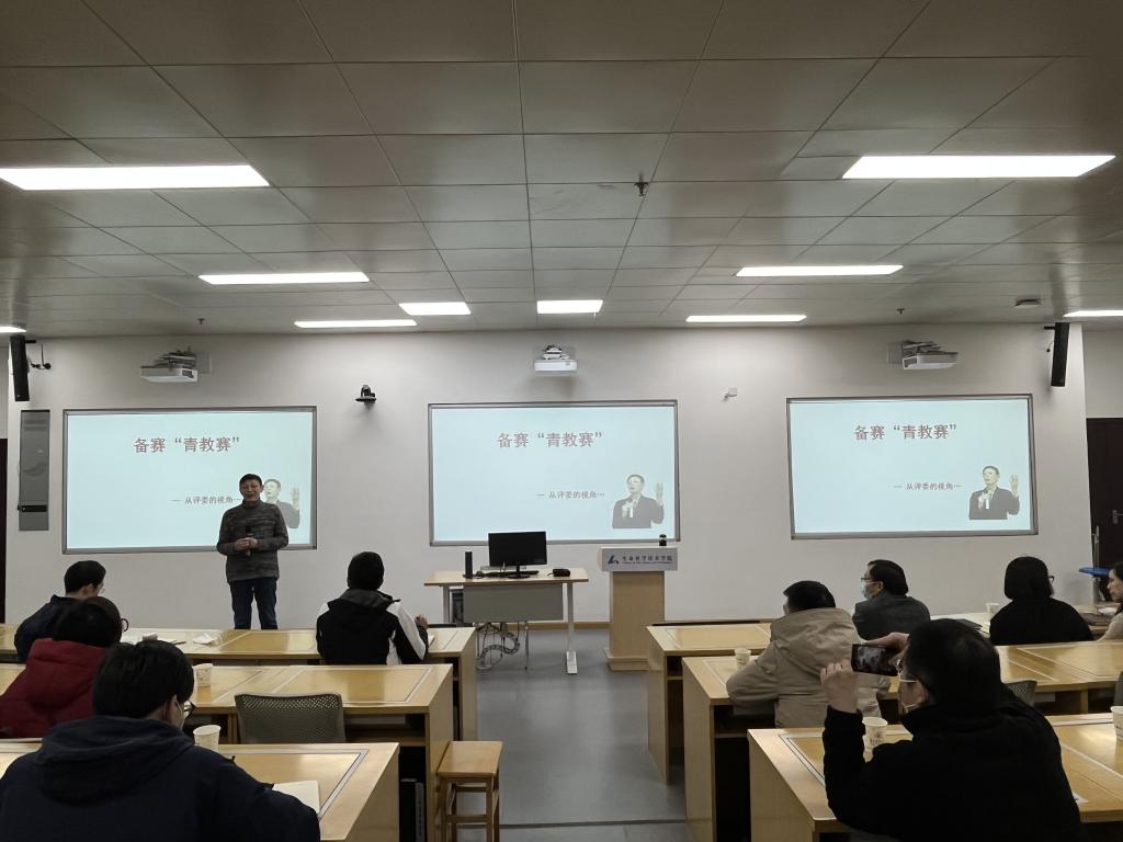 随后,石炜老师从参赛选手的角度,介绍自己参赛的经验,并勉励青年教师们要摆正态度、不怕吃苦,虚心学习、扬长避短,衣着得体、自信大方,主线贯穿、首尾呼应,体现深度、引领思考,以赛促教、立己达人,通过青教赛实现自我教学能力的提升。