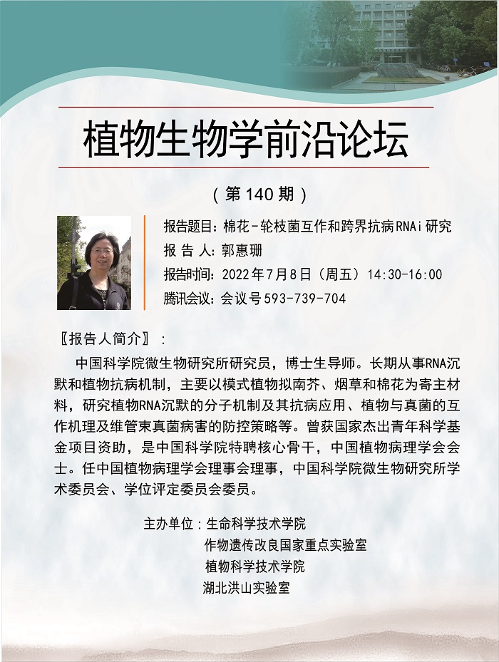 活动时间 报告题目 棉花-轮枝菌互作和跨界抗病RNAi研究
