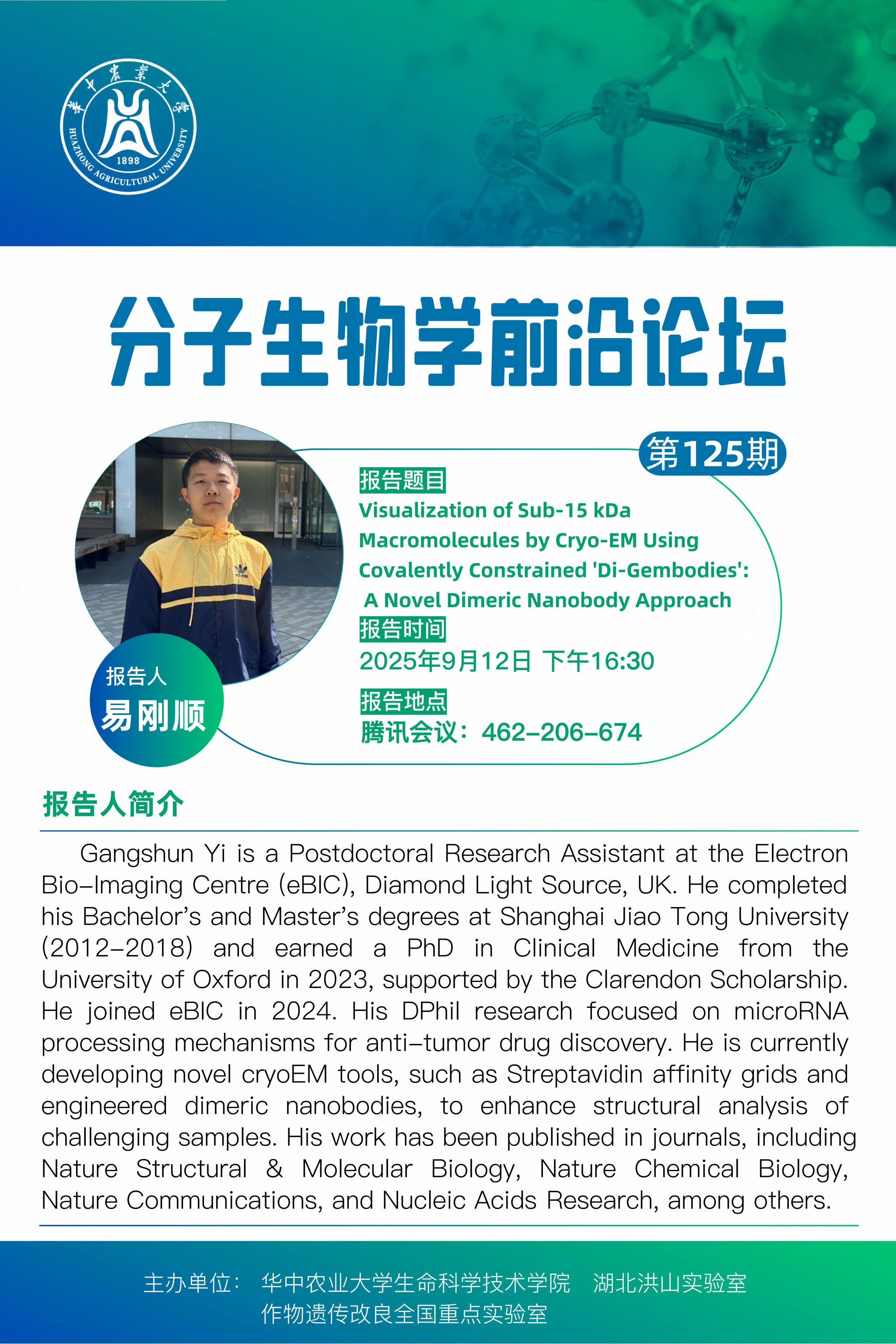活动时间 2025年9月12日 16:30 报告题目 第125期分子生物学前沿论坛