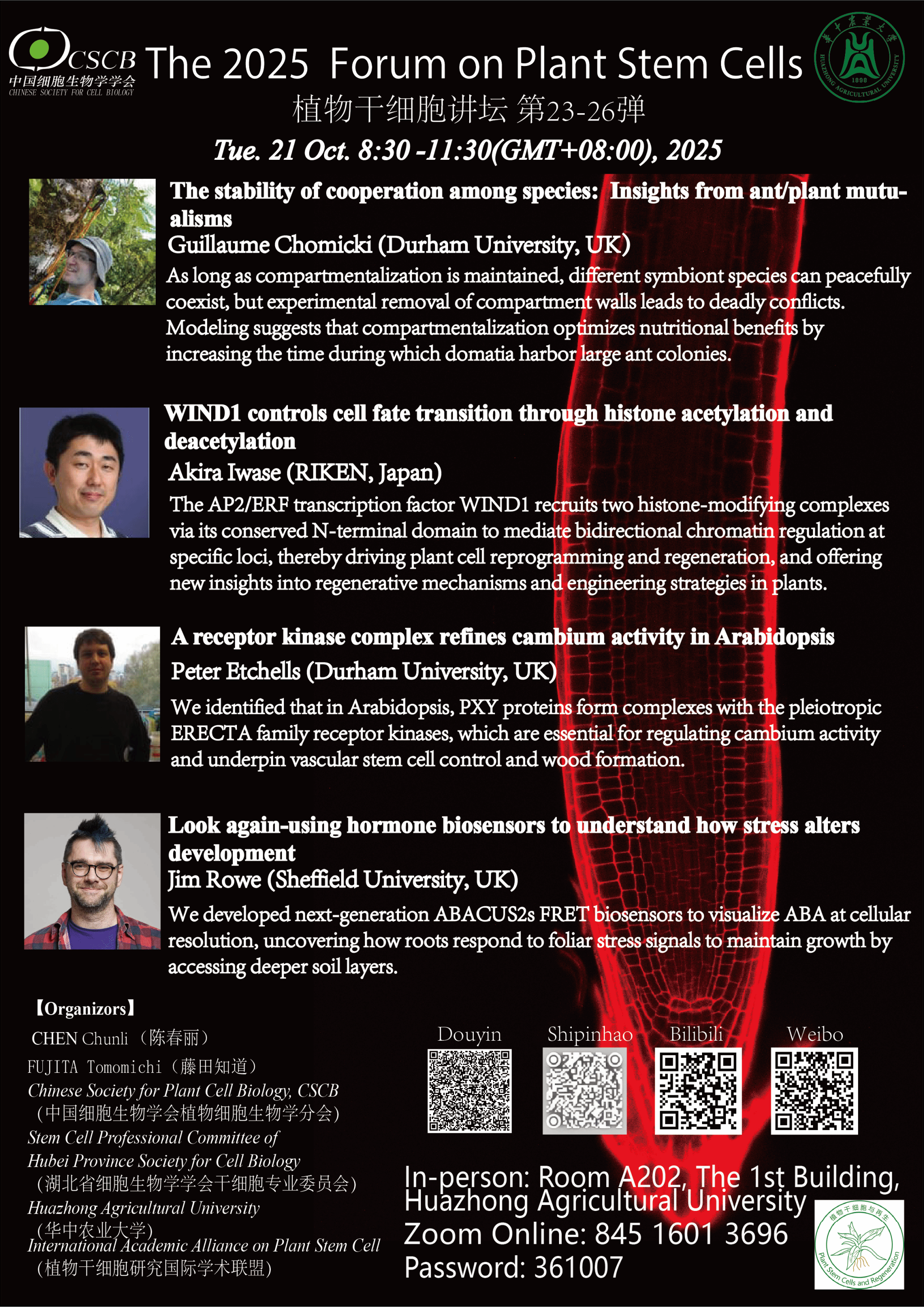 活动时间 10月21日 8:30 -11:30 报告题目 植物干细胞讲坛 第23-26弹