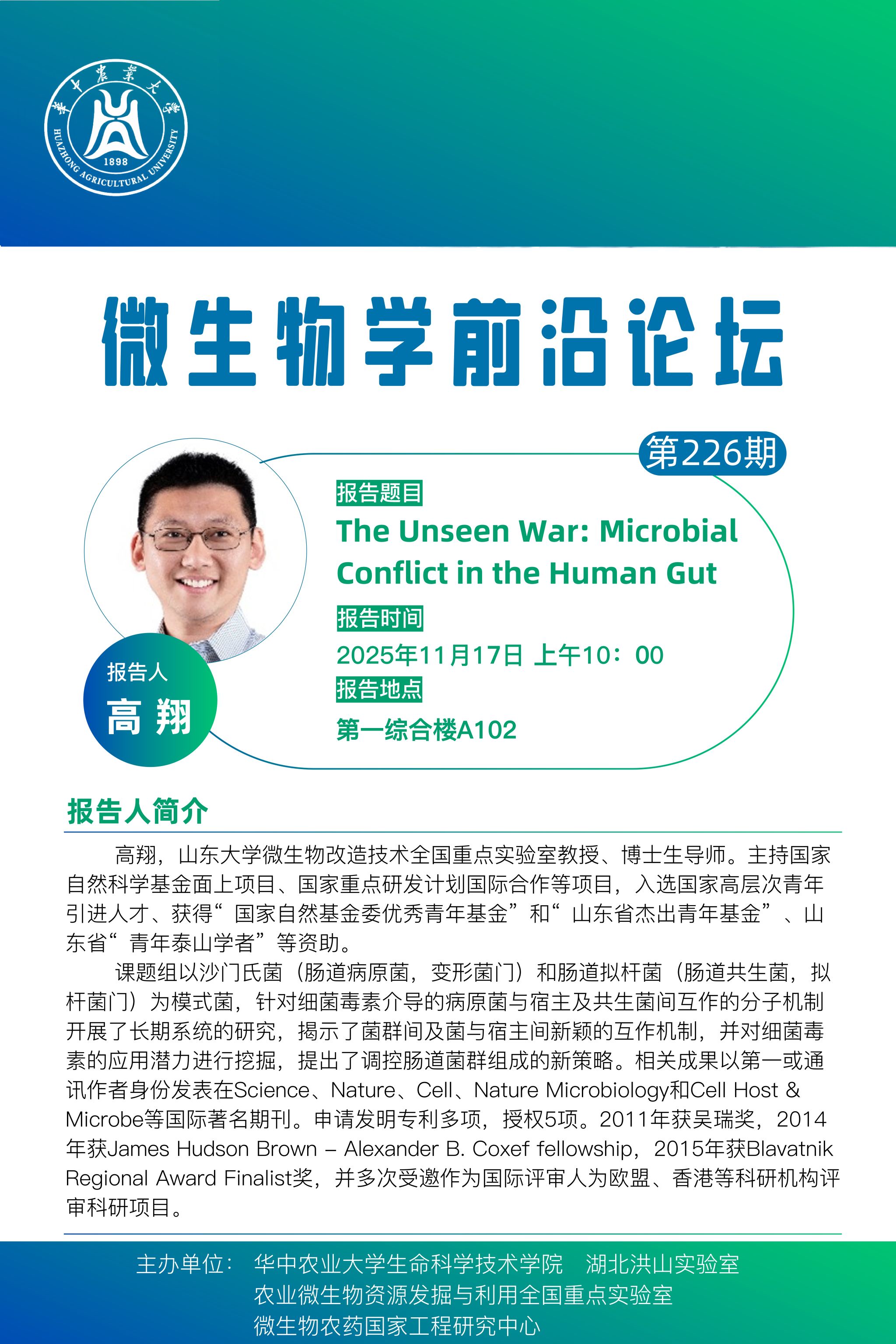 活动时间 2025年11月17日 (周一) 10:00 报告题目 第226期微生物学前沿论坛