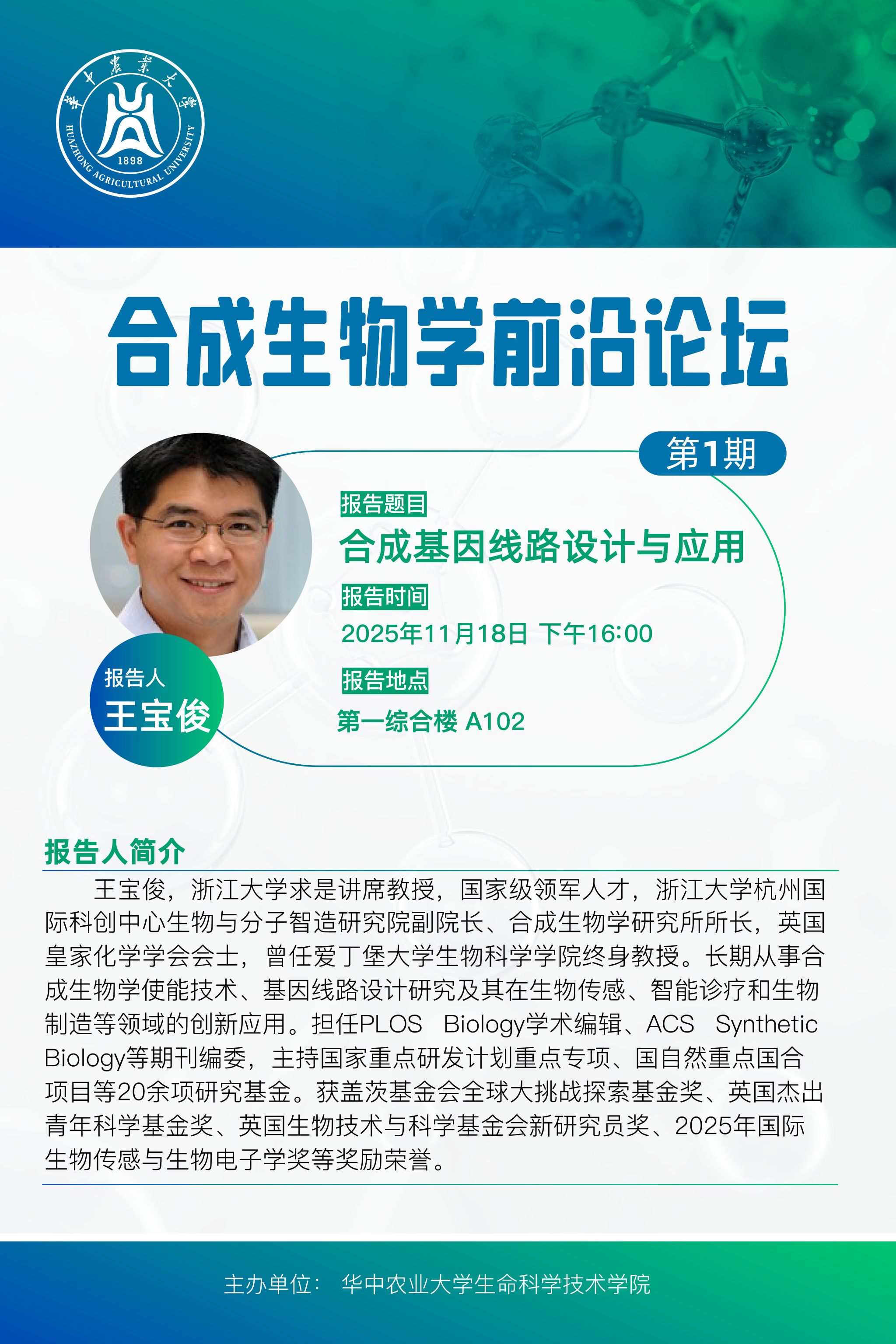 活动时间 2025年11月18日 下午16:00 报告题目 第1期合成生物学前沿论坛