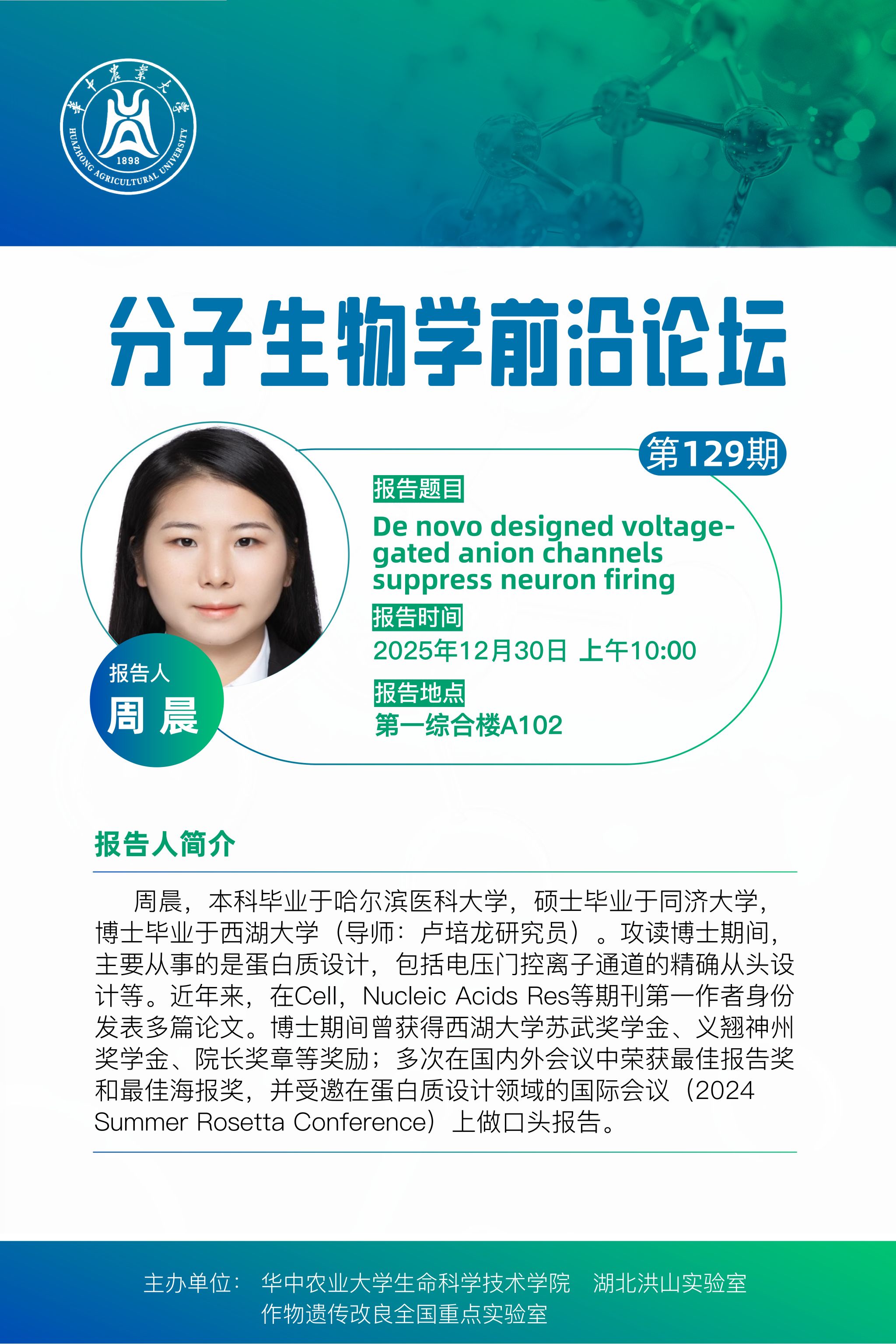 活动时间 2025年12月30日 上午10:00 报告题目 第129期分子生物学前沿论坛