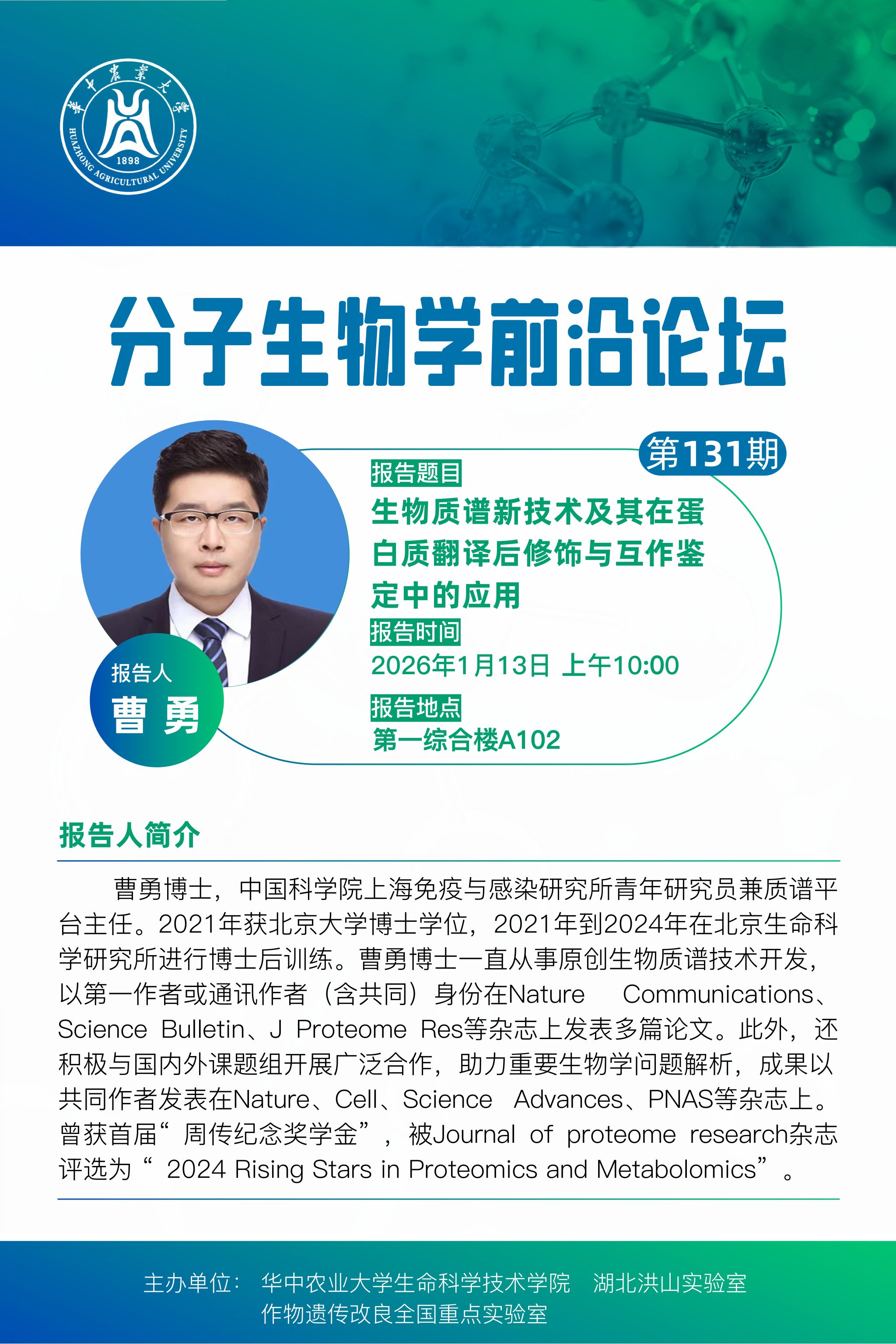 活动时间 2026年1月13日 上午10:00 报告题目 第131期分子生物学前沿论坛