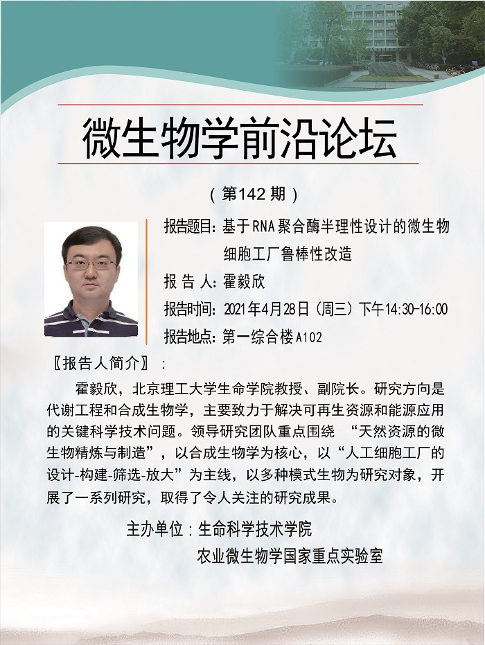 活动时间 报告题目 基于RNA聚合酶半理性设计的微生物细胞工厂鲁棒性改造