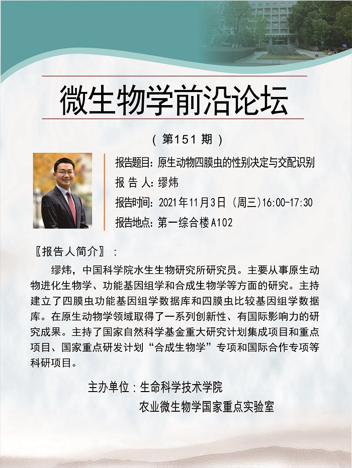 活动时间 报告题目 原生动物四膜虫的性别决定与交配识别