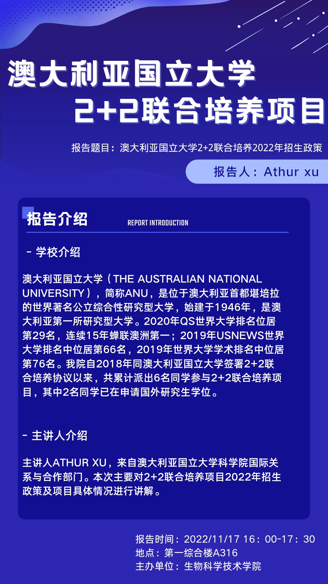 本次主要对2+2联合培养项目2022年招生政策及项目具体情况进行讲解。感兴趣的同学请扫码入QQ群(群号:592089953)便于后续发布会议信息并解疑!