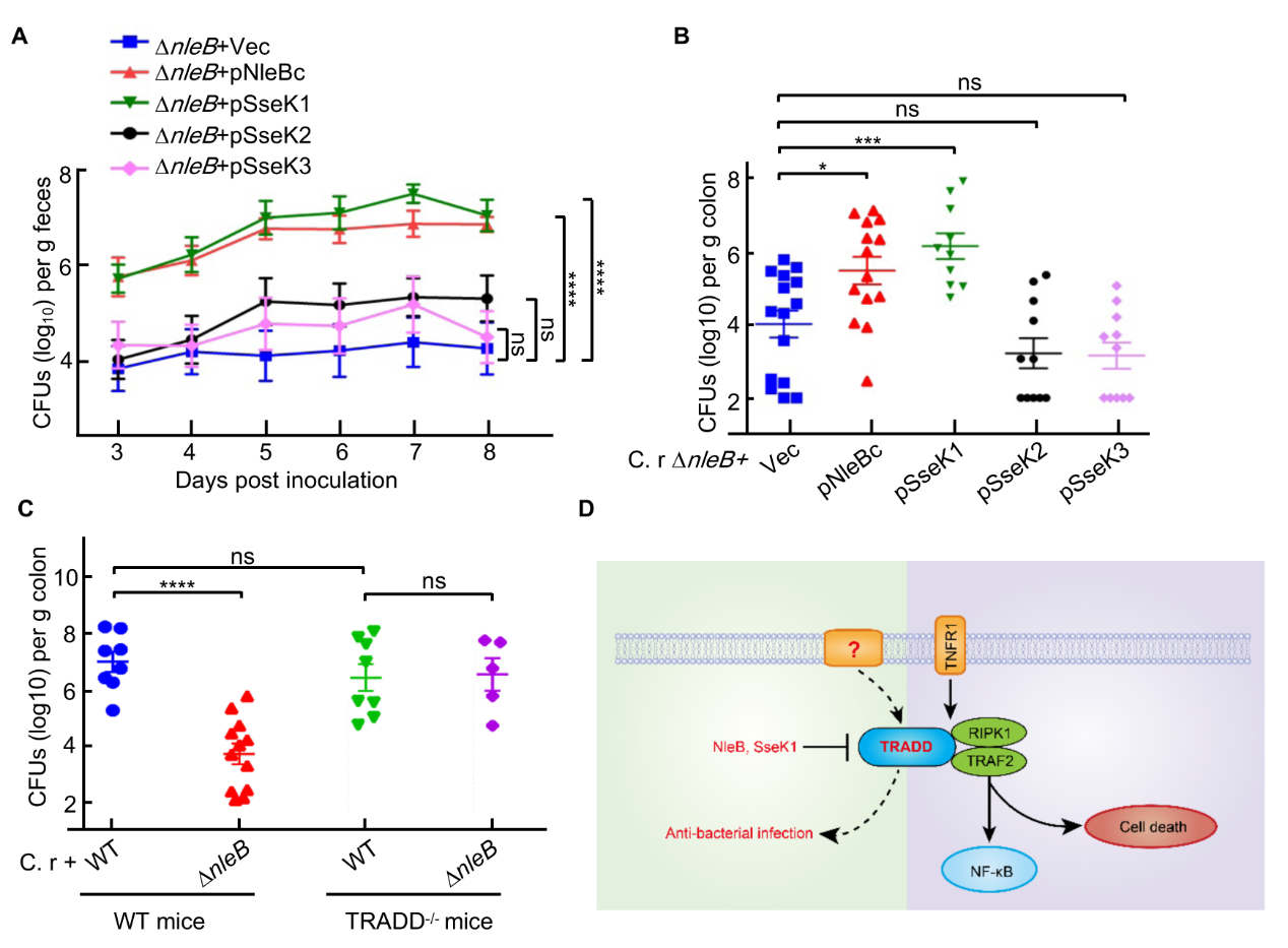 Arg-GlcNAcylation of TRADD by NleB and SseK1 is crucial for bacterial pathogenesis.