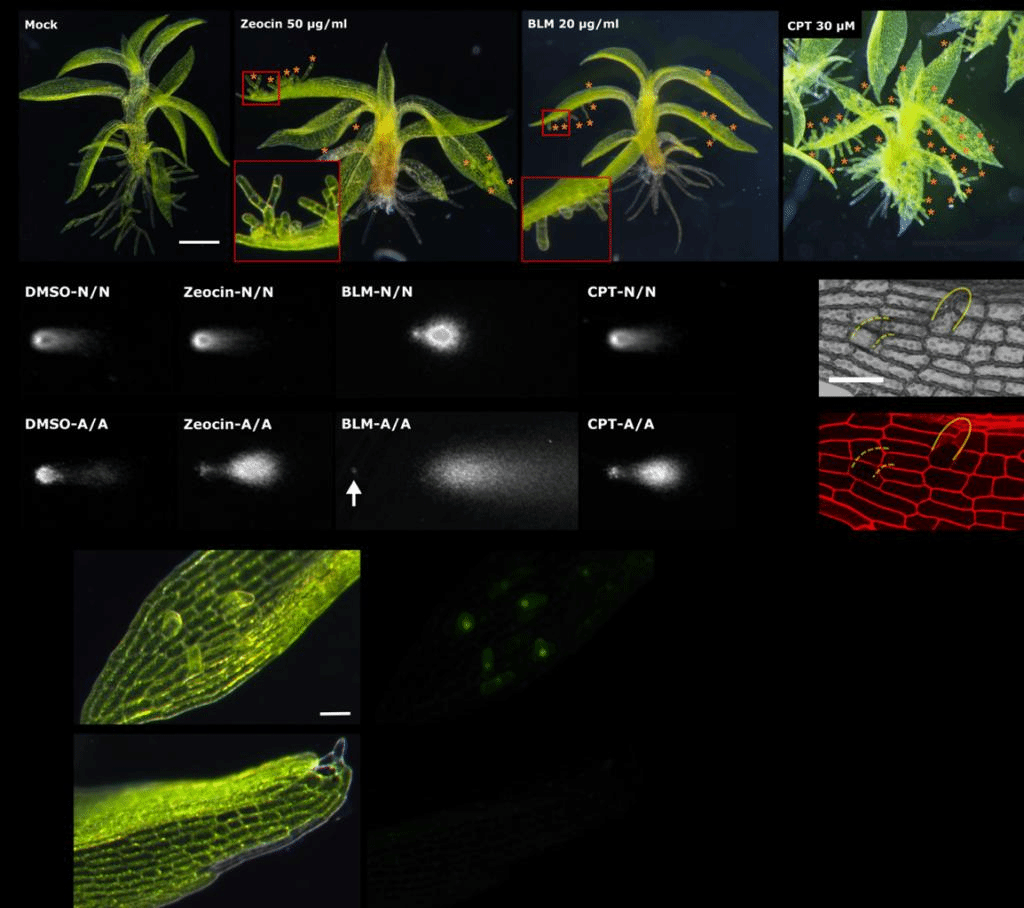 Abstract:DNA damage can result from intrinsic cellular processes and from exposure to stressful environments. Such DNA damage generally threatens genome integrity and cell viability. However, here we report that the transient induction of DNA strand breaks (single-strand breaks, double-strand breaks or both) in the moss Physcomitrella patens can trigger the reprogramming of differentiated leaf cells into stem cells without cell death. After intact leafy shoots (gametophores) were exposed to zeocin, an inducer of DNA strand breaks, the STEM CELL-INDUCING FACTOR 1 (STEMIN1) promoter was activated in some leaf cells. These cells subsequently initiated tip growth and underwent asymmetric cell divisions to form chloronema apical stem cells, which are in an earlier phase of the life cycle than leaf cells and have the ability to form new gametophores. This DNA-strand-break-induced reprogramming required the DNA damage sensor ATR kinase, but not ATM kinase, together with STEMIN1 and closely related proteins. ATR was also indispensable for the induction of STEMIN1 by DNA strand breaks. Our findings indicate that DNA strand breaks, which are usually considered to pose a severe threat to cells, trigger cellular reprogramming towards stem cells via the activity of ATR and STEMINs.