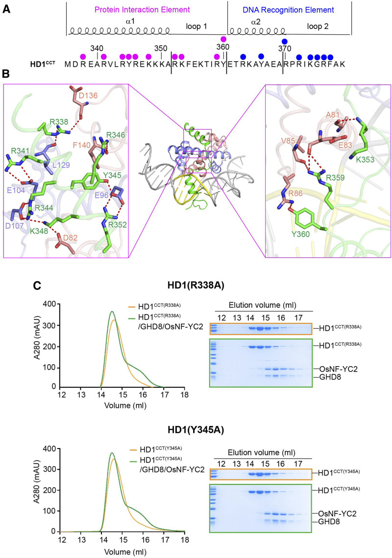 Abstract:CONSTANS, CONSTANS-LIKE, and TIMING OF CAB EXPRESSION1 (CCT) domain-containing proteins are a large family unique to plants. They transcriptionally regulate photoperiodic flowering, circadian rhythms, vernalization, and other related processes. Through their CCT domains, CONSTANS and HEADING DATE1 (HD1) coordinate with the NUCLEAR FACTOR Y (NF-Y) B/C dimer to specifically target a conserved 'CCACA' motif within the promoters of their target genes. However, the mechanism underlying DNA recognition by the CCT domain remains unclear. Here we determined the crystal structures of the rice (Oryza sativa) NF-YB/YC dimer and the florigen gene Heading date 3a (Hd3a)-bound HD1CCT/NF-YB/YC trimer with resolutions of 2.0 Å and 2.55 Å, respectively. The CCT domain of HD1 displays an elongated structure containing two α-helices and two loops, tethering Hd3a to the NF-YB/YC dimer. Helix α2 and loop 2 are anchored into the minor groove of the 'CCACA' motif, which determines the specific base recognition. Our structures reveal the interaction mechanism among the CCT domain, NF-YB/YC dimer, and the target DNA. These results not only provide insight into the network between the CCT proteins and NF-Y subunits, but also offer potential approaches for improving productivity and global adaptability of crops by manipulating florigen expression.