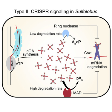 Abstract:Type III CRISPR-Cas systems initiate an intracellular signaling pathway to confer immunity. The signaling pathway includes synthesis of cyclic oligo-adenylate (cOA) and activation of the RNase activity of type III accessory ribonuclease Csm6/Csx1 by cOA. After the immune response, cOA should be cleared on time to avoid constant cellular RNA degradation. In this study, we find a metal-dependent cOA degradation activity in Sulfolobus islandicus. The activity is associated with the cell membrane and able to accelerate cOA clearance at a high cOA level. Further, we show that a metal-dependent and membrane-associated DHH-DHHA1 family nuclease (MAD) rapidly cleaves cOA and deactivates Csx1 ribonuclease. The cOA degradation efficiency of MAD is much higher than the cellular ring nuclease. However, the subcellular organization may prevent it from degrading nascent cOA. Together, the data suggest that MAD acts as the second cOA degrader after the ring nuclease to remove diffused redundant cOA.