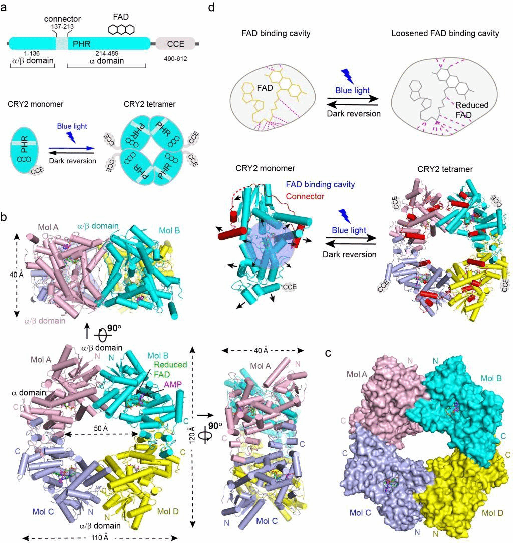 Abstract:The blue-light receptor cryptochrome (CRY) in plants undergoes oligomerization to transduce blue-light signals after irradiation, but the corresponding molecular mechanism remains poorly understood. Here, we report the cryogenic electron microscopy structure of a blue-light-activated CRY2 tetramer at a resolution of 3.1 Å, which shows how the CRY2 tetramer assembles. Our study provides insights into blue-light-mediated activation of CRY2 and a theoretical basis for developing regulators of CRYs for optogenetic manipulation.