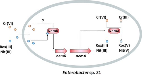 Abstract: Synthetic aromatic arsenicals such as roxarsone (Rox(V)) and nitarsone (Nit(V)) have been used as animal growth enhancers and herbicides. Microbes contribute to redox cycling between the relatively less toxic pentavalent and highly toxic trivalent arsenicals. In this study, we report the identification of nemRA operon from Enterobacter sp. Z1 and show that it is involved in trivalent organoarsenical oxidation. Expression of nemA is induced by chromate (Cr(VI)), Rox(III), and Nit(III). Heterologous expression of NemA in Escherichia coli confers resistance to Cr(VI), methylarsenite (MAs(III)), Rox(III), and Nit(III). Purified NemA catalyzes simultaneous Cr(VI) reduction and MAs(III)/Rox(III)/Nit(III) oxidation, and oxidation was enhanced in the presence of Cr(VI). The results of electrophoretic mobility shift assays and fluorescence assays demonstrate that the transcriptional repressor, NemR, binds to either Rox(III) or Nit(III). NemR has three conserved cysteine residues, Cys21, Cys106, and Cys116. Mutation of any of the three resulted in loss of response to Rox(III)/Nit(III), indicating that they form an Rox(III)/Nit(III) binding site. These results show that NemA is a novel trivalent organoarsenical oxidase that is regulated by the trivalent organoarsenical-selective repressor NemR. This discovery expands our knowledge of the molecular mechanisms of organoarsenical oxidation and provides a basis for studying the redox coupling of environmental toxic compounds.